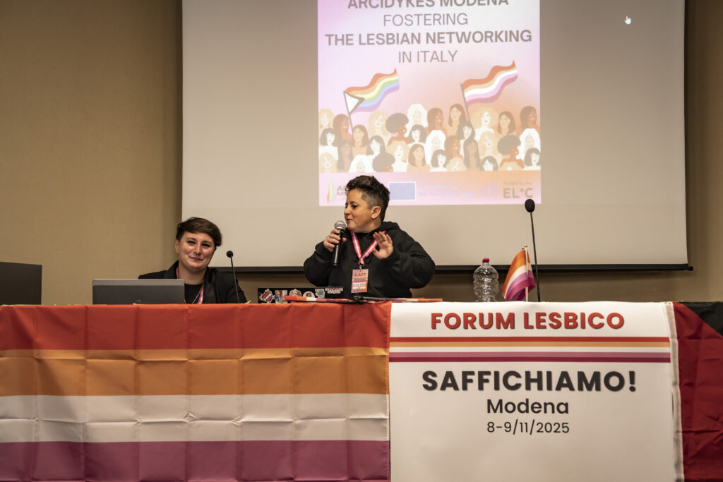 Il progetto è volto a potenziare rispettivamente l’attivismo lesbico del Gruppo Donne LBTQIA+* di Arcigay Modena, costituitosi nel 2018, e il movimento lesbico italiano, e ha ospitato iniziative presenziali e virtuali di networking ed elaborazione politica a focus lesbico. Fra queste, SaffichiaMO!, un Forum Lesbico della durata di due giorni, svoltosi a Modena l’8 e 9 novembre 2025. SaffichiaMO! ha costituito un’occasione straordinaria di socializzazione, incontro e confronto militante fra persone attiviste transfemministe lesbic*, provenienti da tutta Italia, interessate a promuovere – sia indipendentemente che in termini cooperativi, a livello locale e nazionale – l’adozione di agende politiche e socioculturali lesbiche. SaffichiaMO!, forum Lesbico aggregativo, attivistico e ludico-ricreativo, ha ospitato sedute parallele e plenarie di elaborazione politica nell’ambito di sei distinti tavoli tematici: Tessere reti e costruire alleanze strategiche per uscire dalla bolla; Atlante delle realtà lesbiche in Italia: mappatura ed iniziative territoriali; Visibilità, diritti e cittadinanza attiva; Salute e benessere delle persone lesbiche; Sessualità lesbo-transfemminista; Prospettive lesbiche sull’intersezionalità: appartenenze multiple e marginalità.