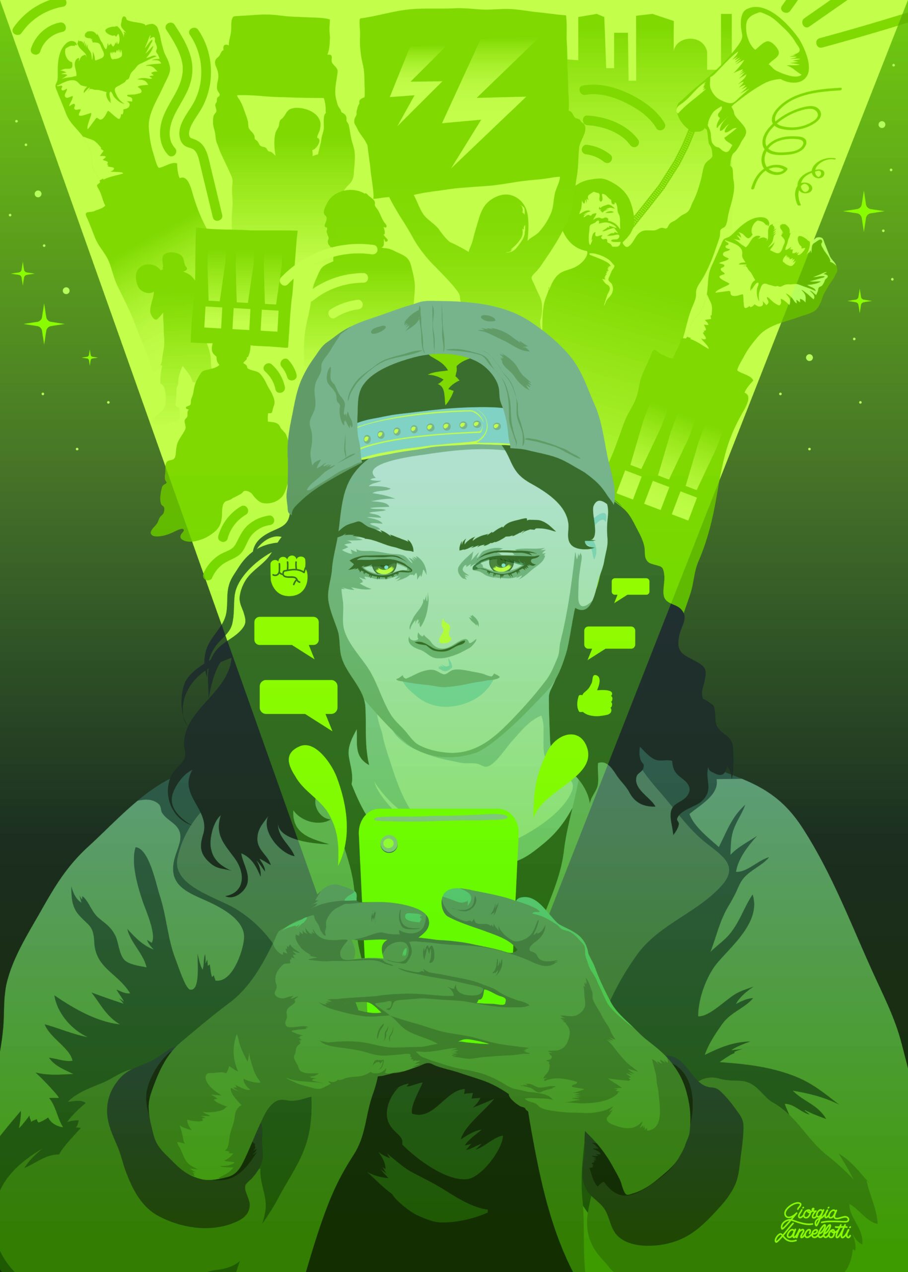 Giorgia Lancellotti è un’illustratrice e key visual designer con un approccio multidisciplinare che unisce arte, design e storytelling. Ha lavorato per oltre dieci anni in Champion Europe occupandosi di illustrazione, grafica e visual concepts. Parallelamente, come freelance, collabora con realtà creative come Caffè Pascucci, Ravensburger, Jamba Juice, Beccogiallo, con la content creator Vanessa Villa – Fight Gently – e La Città delle Donne di Bologna. Ha partecipato a numerosi progetti di CHEAP, collettivo di arte pubblica di Bologna, e porta avanti una ricerca artistica personale con Wake Up. Il tema che le abbiamo proposto per il poster di gennaio è l’attivismo attraverso la comunicazione online (e non solo le manifestazioni in piazza).